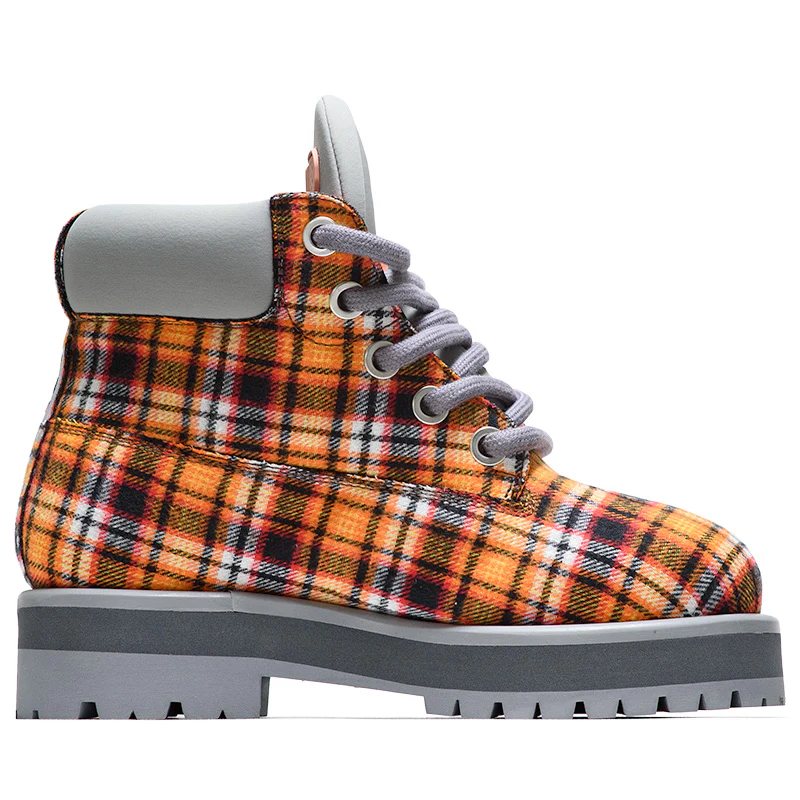 - Flannel upper with tartan pattern